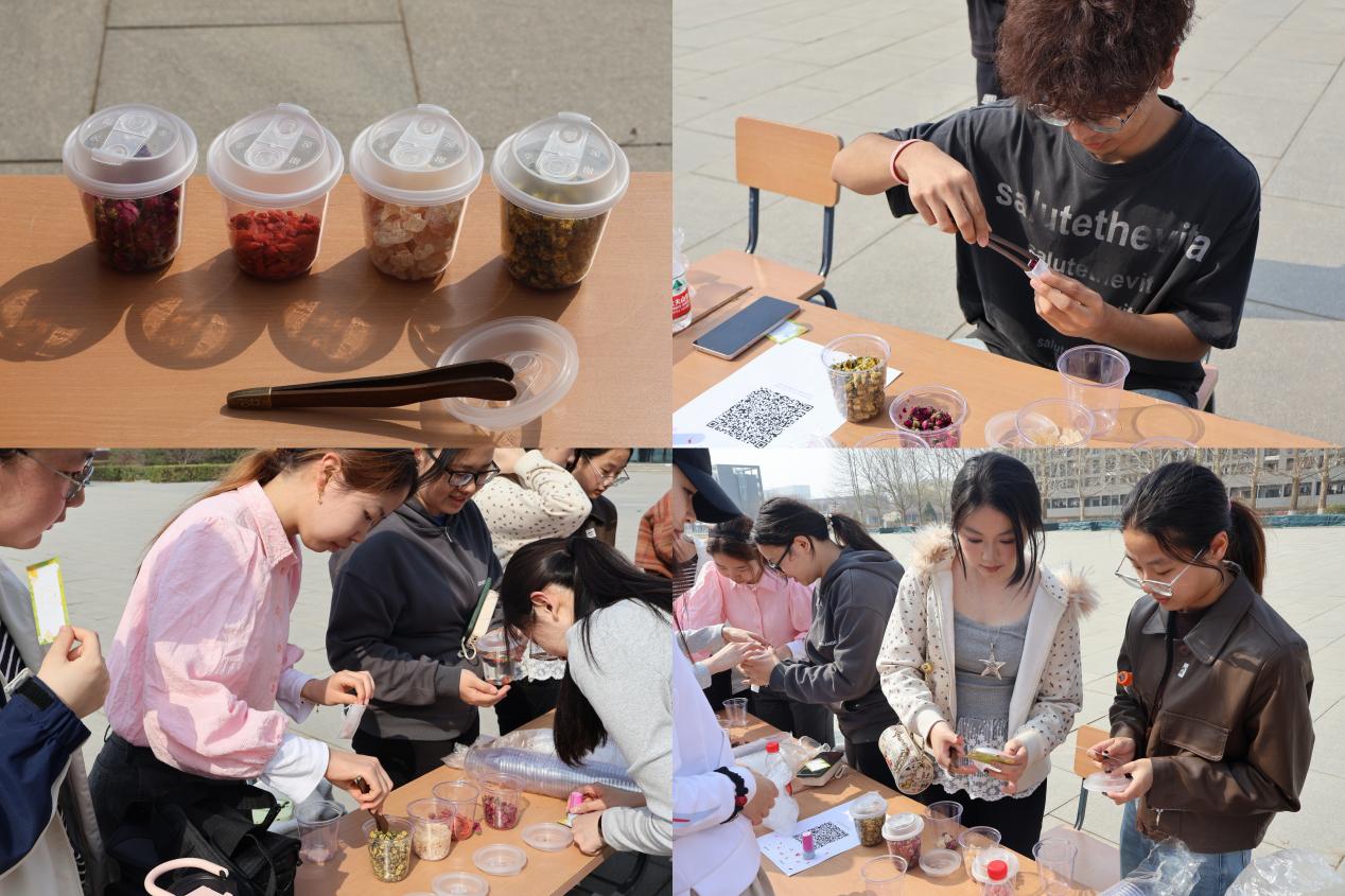 在“春日花茗手作”摊位前,同学们凭集章卡领取茶包材料,依照个人喜好搭配玫瑰花、胎菊、枸杞与冰糖,亲手冲泡出一杯杯清香四溢的“双花茶”。热水注入杯中,花香与茶香袅袅升腾,大家或驻足品饮,或轻声交流,在忙碌的学习生活中觅得一刻悠然,细细品味春天的温润与美好。