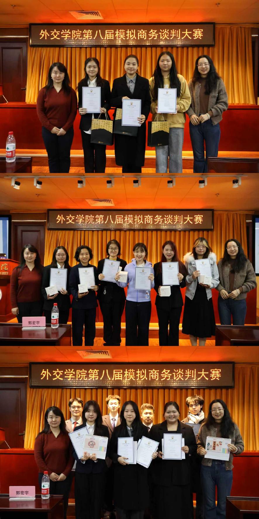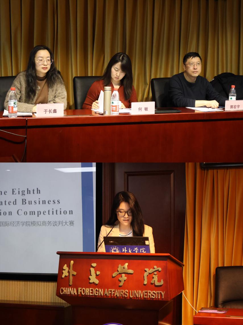 为搭建国际商务实践平台,助力学生提升商业谈判策略运用与综合协作能力,国际经济学院于11月26日下午,在沙河校区行政楼2012会议室成功举办外交学院第八届模拟商务谈判大赛。本次赛事特邀外交学院国际经济学院郭宏宇、何敏和于长鑫三位老师担任评委,国际经济学院2023级陈宇涵同学主持。